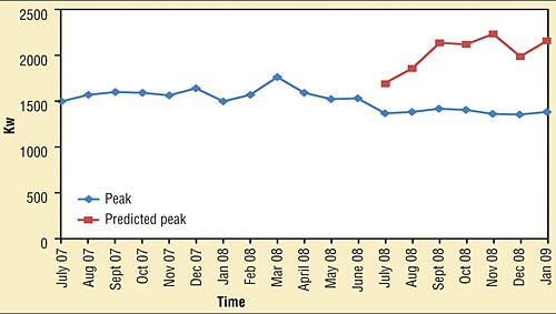 The energy-optimization system began regulating VAC AERO’s peak electrical demand in July 2008. The monthly savings have increased over time as the peak limit has been lowered. The system is currently keeping peak demand approximately 30% lower than it would be without energy optimization (Fig. 3).