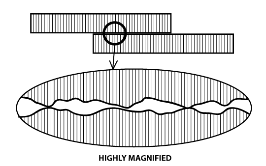 Of course these recommendations are for clearances “measured” at brazing temperature, since that is the when the BFM is molten and able to flow through the joint. The “zero-clearance” (0.000″) basically means that the metal surfaces are in direct contact with each other, which is fine — unless you have purposely polished the faying surfaces prior to brazing (rarely, if ever, recommended). Note in the illustration on the left that the normal as-received, as-machined, as-rolled surfaces of metals provide enough surface “roughness” (hills and valleys) to allow space for capillary action to occur when the two faying surfaces are in actual direct contact.
