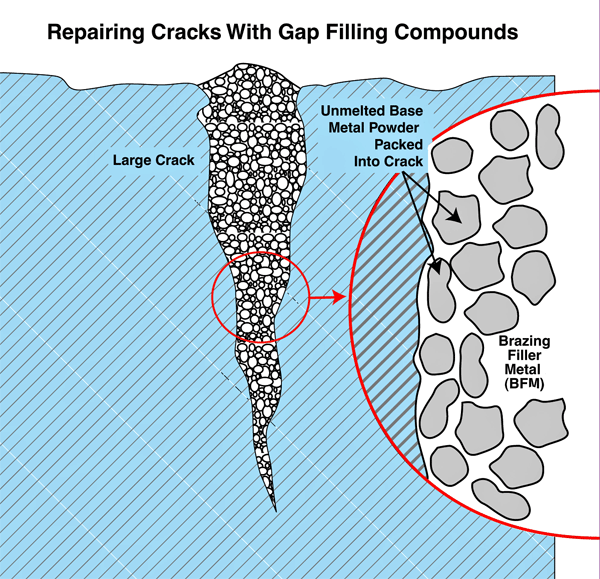 To repair cracks in worn surfaces, it often is necessary to braze gaps that are 0.030 inch or more wide. This is extremely difficult using only BFM and often also requires special gap-filling compounds (GFCs), which may be packed directly into the crack before application of the BFM or mixed into the BFM paste ahead of time.